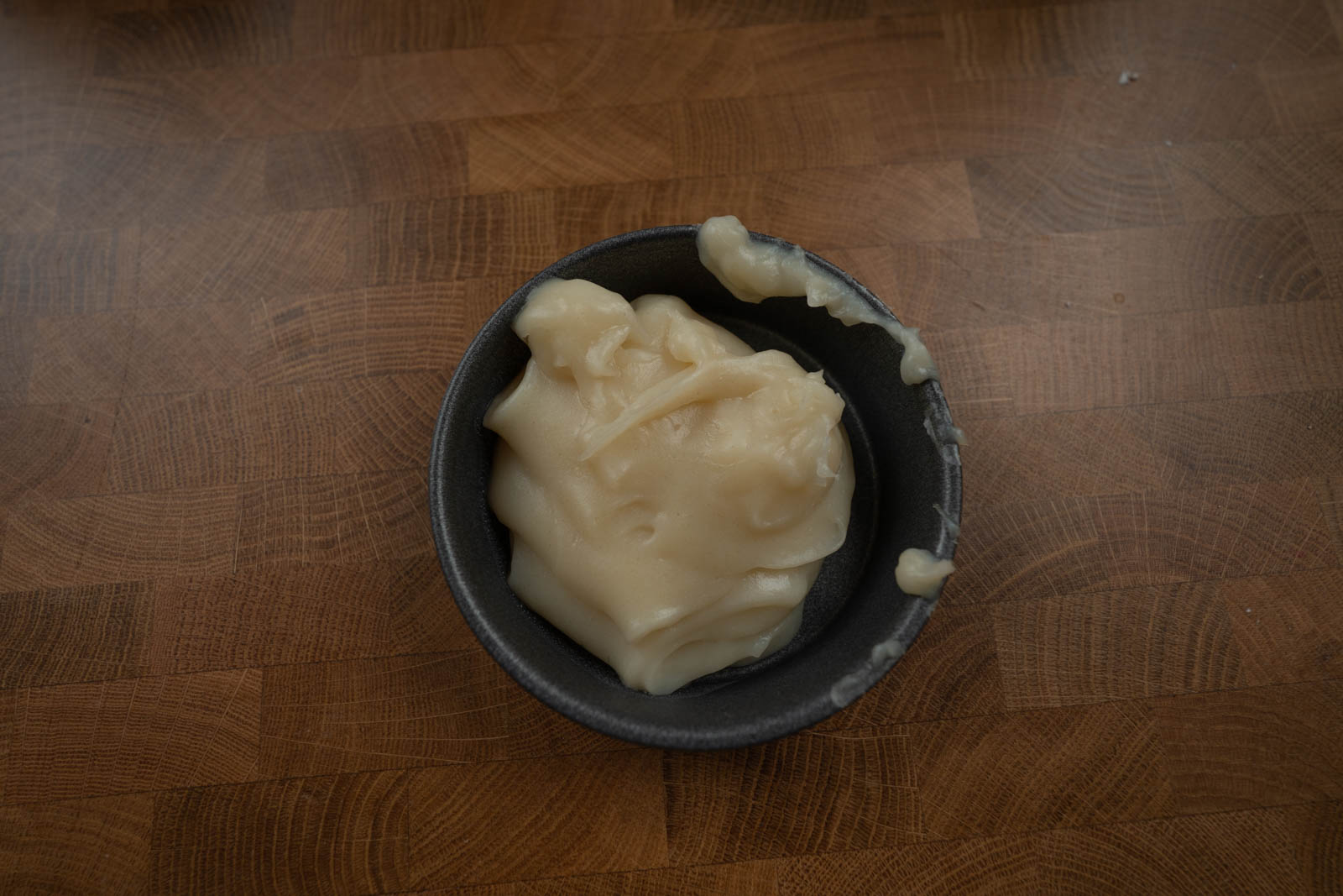 - First make the tangzhong. Mix 40g bread flour with 200g water in a small pan. Once thoroughly mixed, put on a medium heat and keep stirring until mixture thickens to a paste. Scrape out into a container and set in the fridge for 6 hours. You can even make this the night before. Allow it to come to room temperature before use.