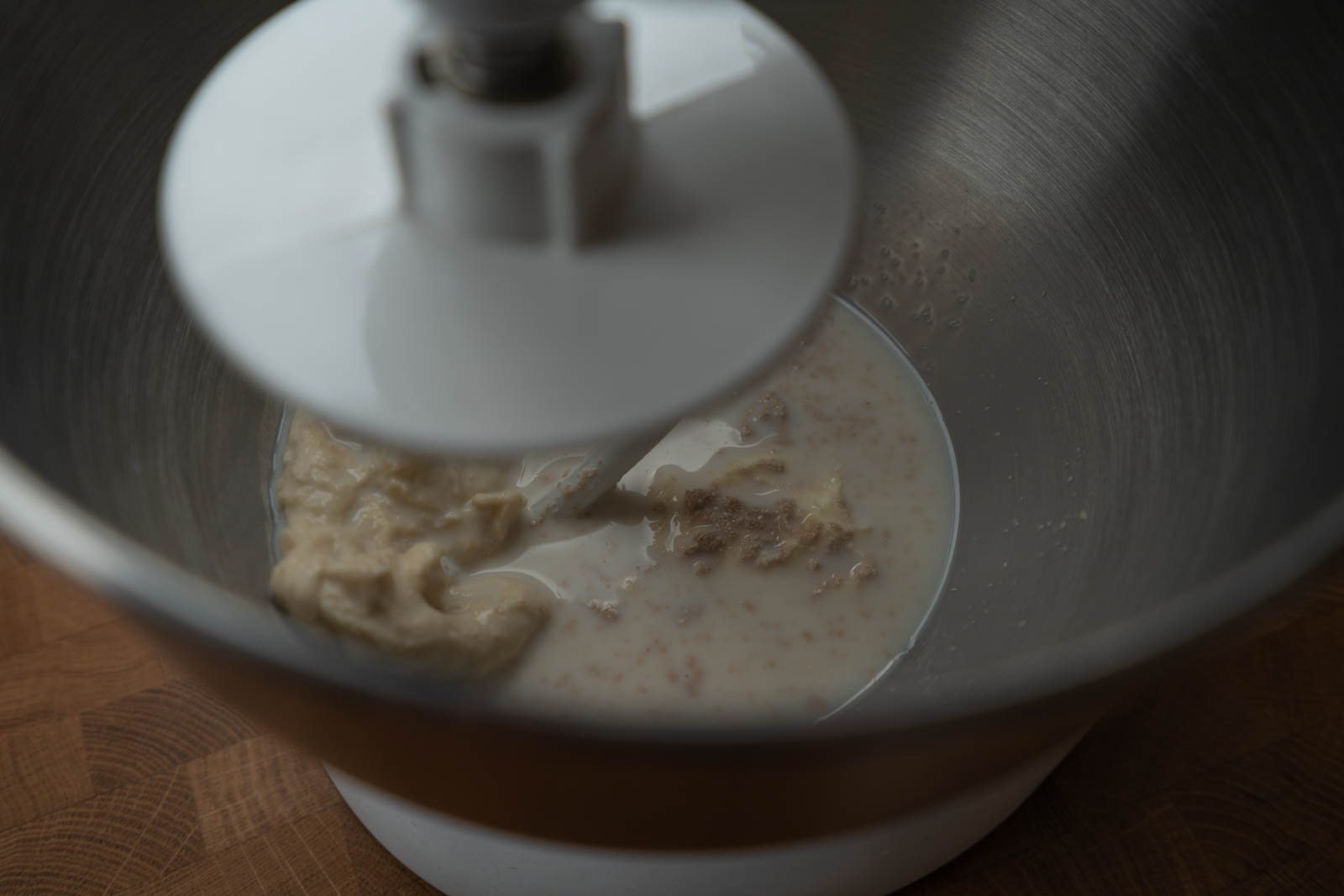 - Pour the room temperature milk and butter, sugar and yeast into a stand mixer bowl. Break apart the yudane into smaller chunks and add them into the bowl.
