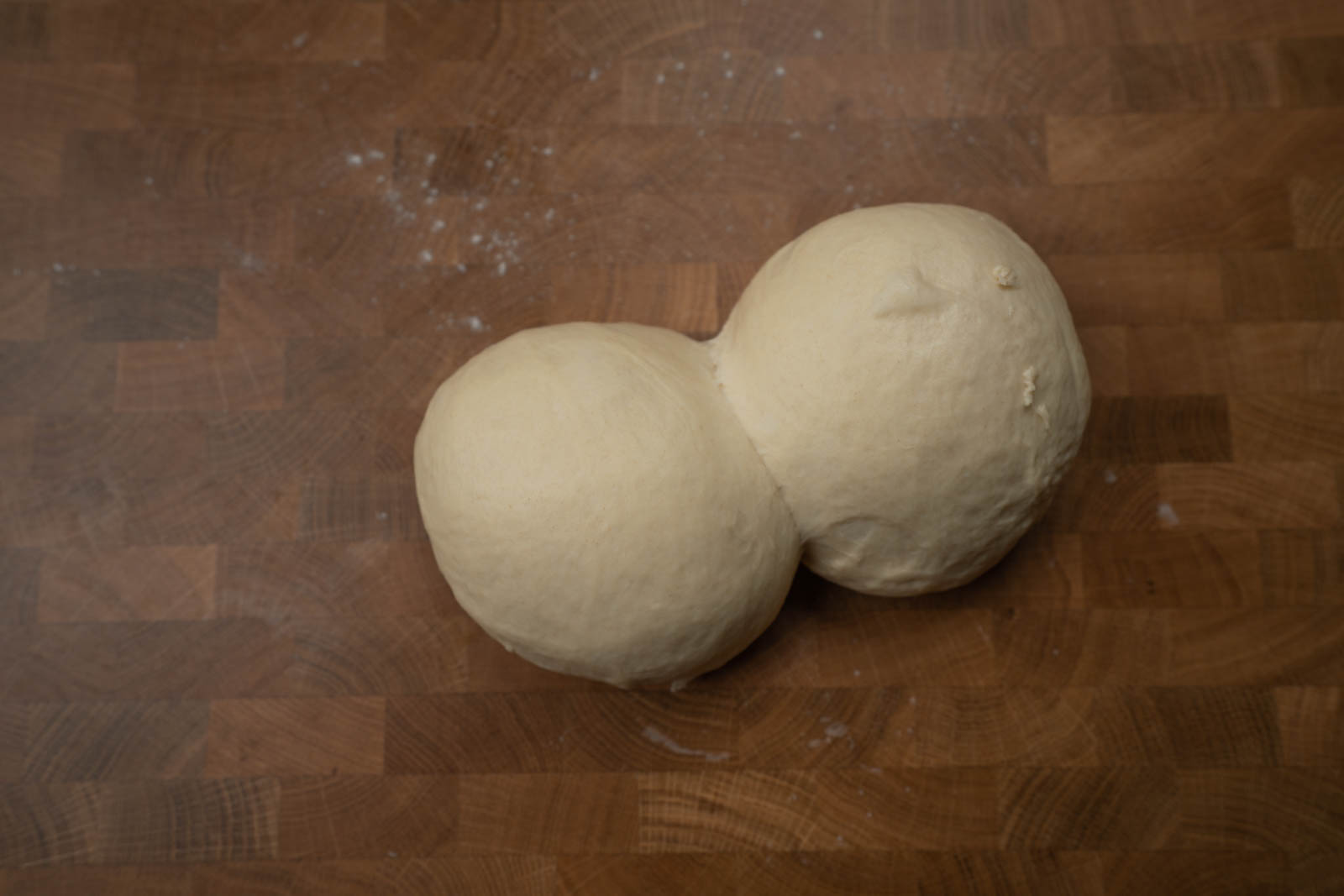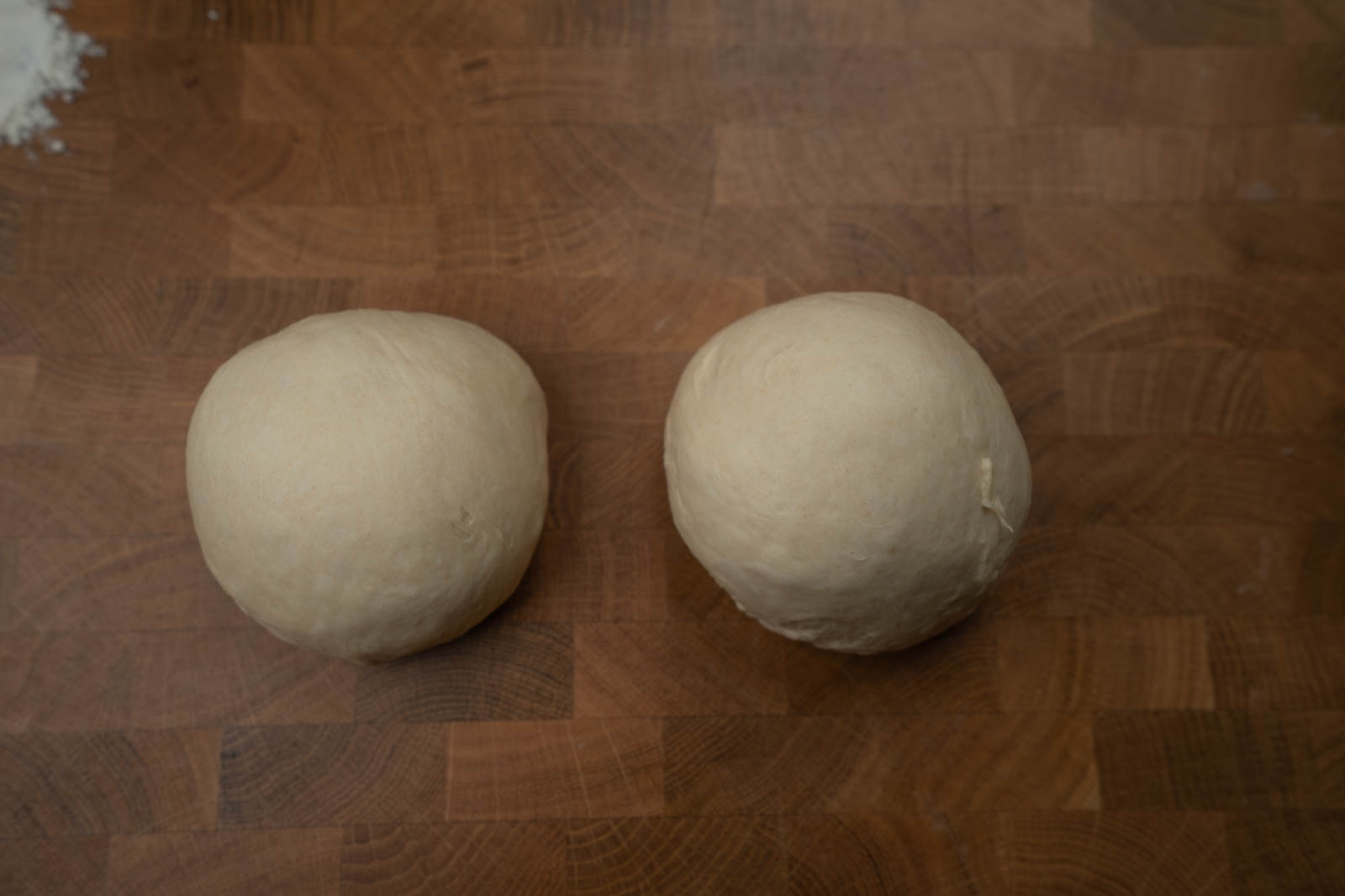 - Punch the dough down and cut the dough into two equal parts with a scraper and roll them into boules again.