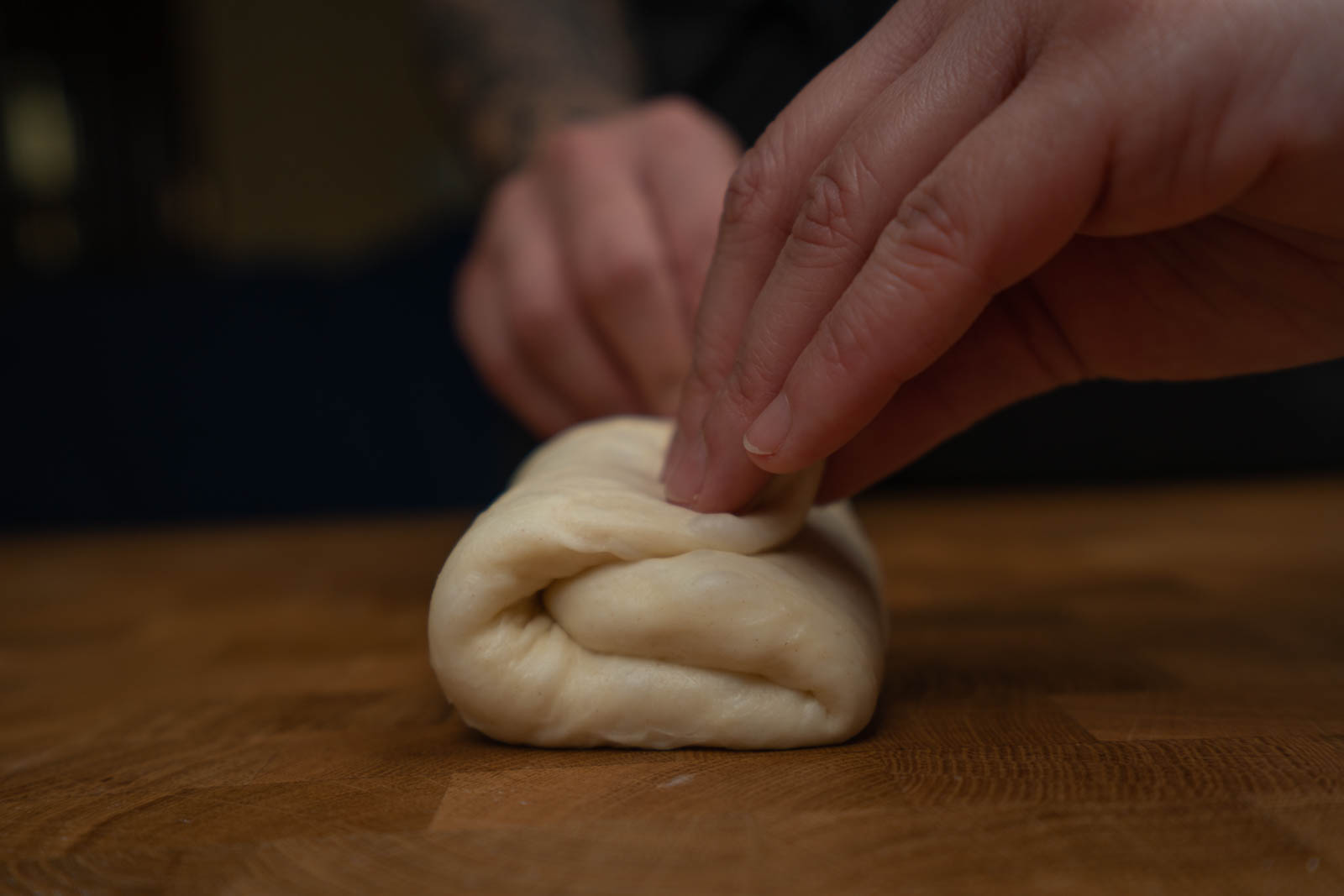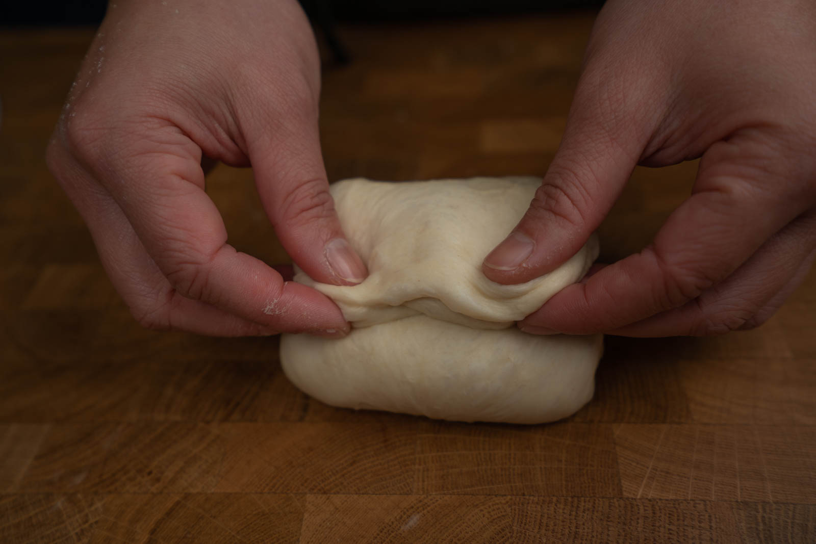 - Fold the dough in thirds, then rotate the dough 90 degrees and fold again in thirds and then pinch the seam closed.