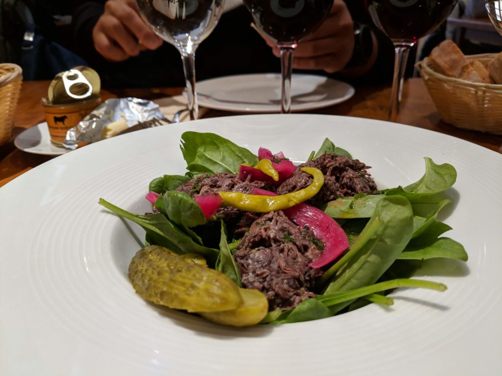 • A stewed and shredded beef served cold on a bed of spinach with red onions and little yellow peppers and a little pickle. Flavors were unremarkable, though the beef was tender and the onions bright.