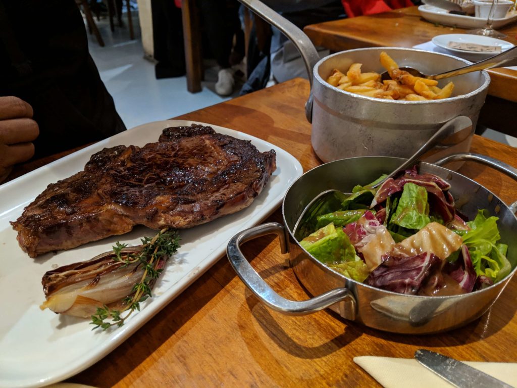 • The ribsteak was flavorful, cooked more rare than rare medium, not a problem for us. It comes with salad and fries, nothing special. The steak was the definitely the best dish of the meal.