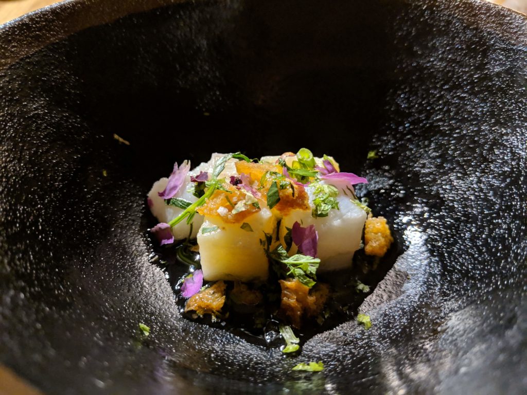 • The first plate was tasty cubed fish and potato. A great mix of flavors and textures; they like to use crispy bread crumbs on lots of their dishes here.