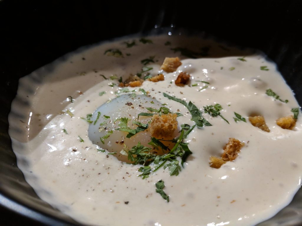 • A bowl of chowder with mushrooms and their take on the 64-degree egg followed. I believe they cook theirs at 68 degrees (celsius) for 68 minutes. This is some serious poaching for an egg, which meant the whole egg was still very runny though fully cooked. We weren’t sure if it was intended but we opted to pop the egg and eat the yolk with the chowder, which tasted like a very luxurious party.