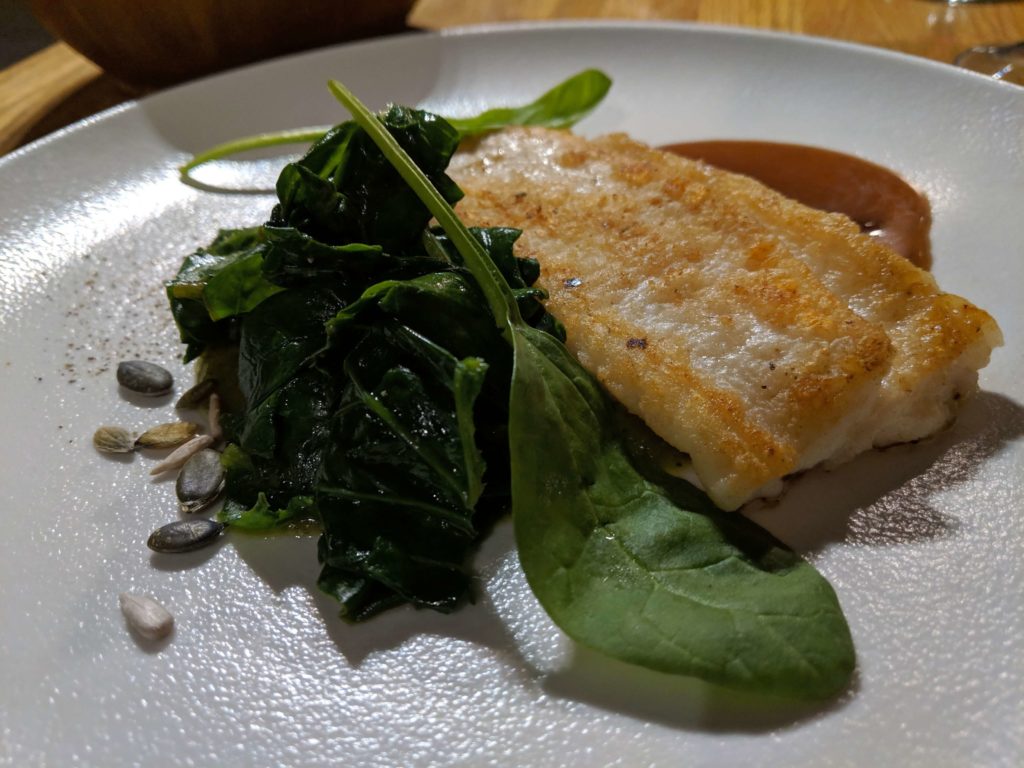 • A lightly fried fish filet on zucchini mash and cooked spinach with a soy sauce based sauce. This dish was probably the least interesting, the zucchini mash was watery as you might expect and we were a bit baffled at the 2 leaves of raw spinach used to garnish a plate that has cooked spinach.