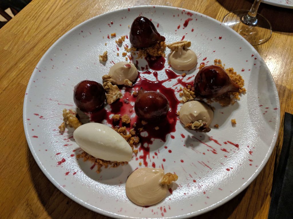 • The final savory plate was a seared duck with mushrooms, on a bed of mash and “meat juice”. It came with a single blackberry, which paired really well with the duck, so cut that little sucker up and distribute accordingly.
