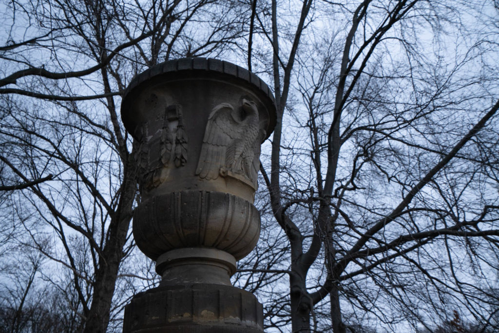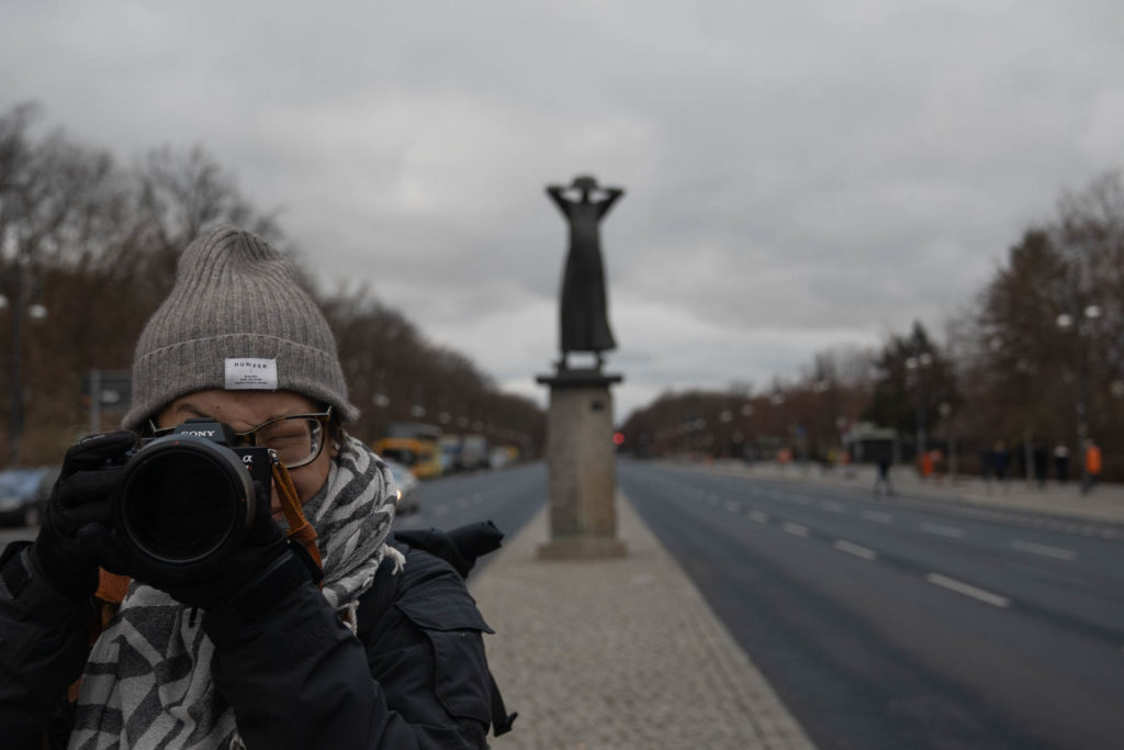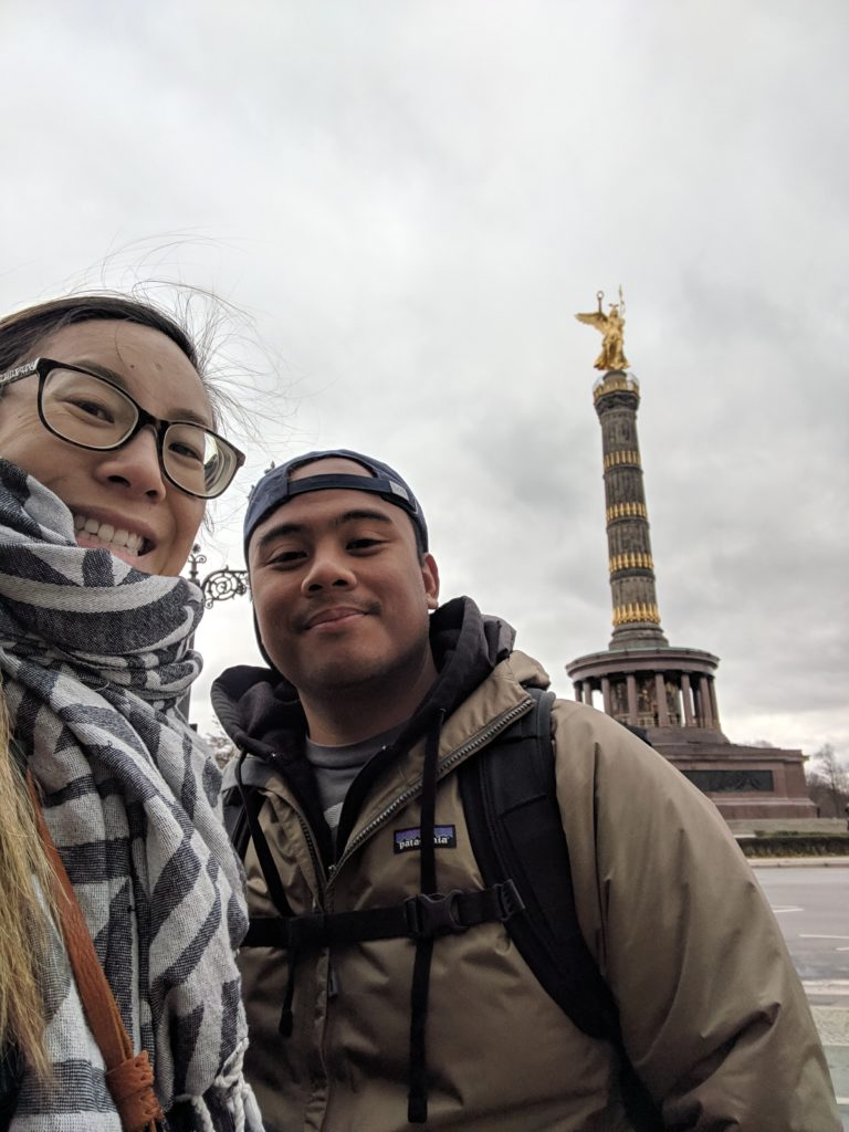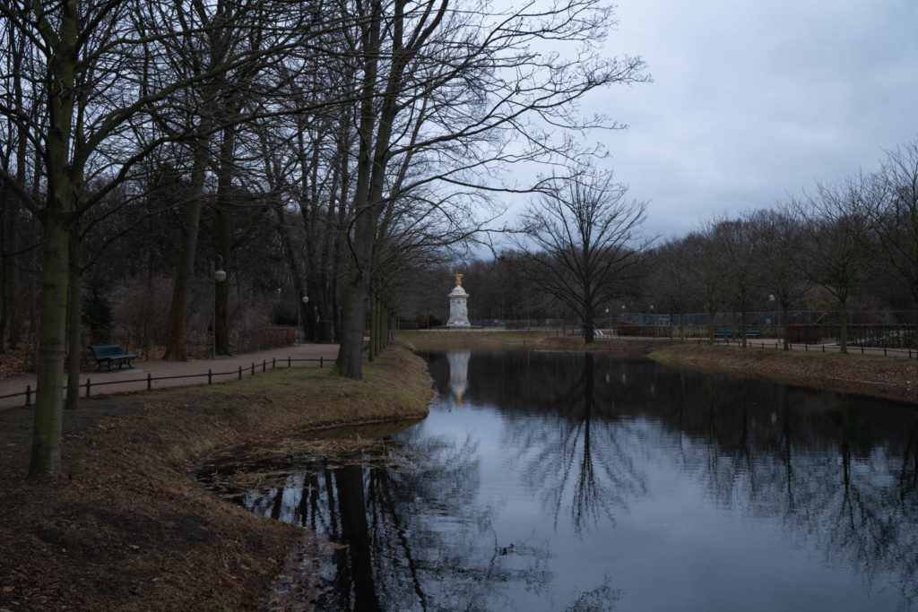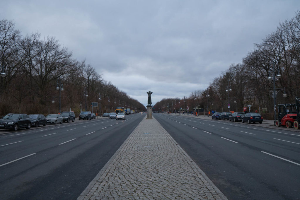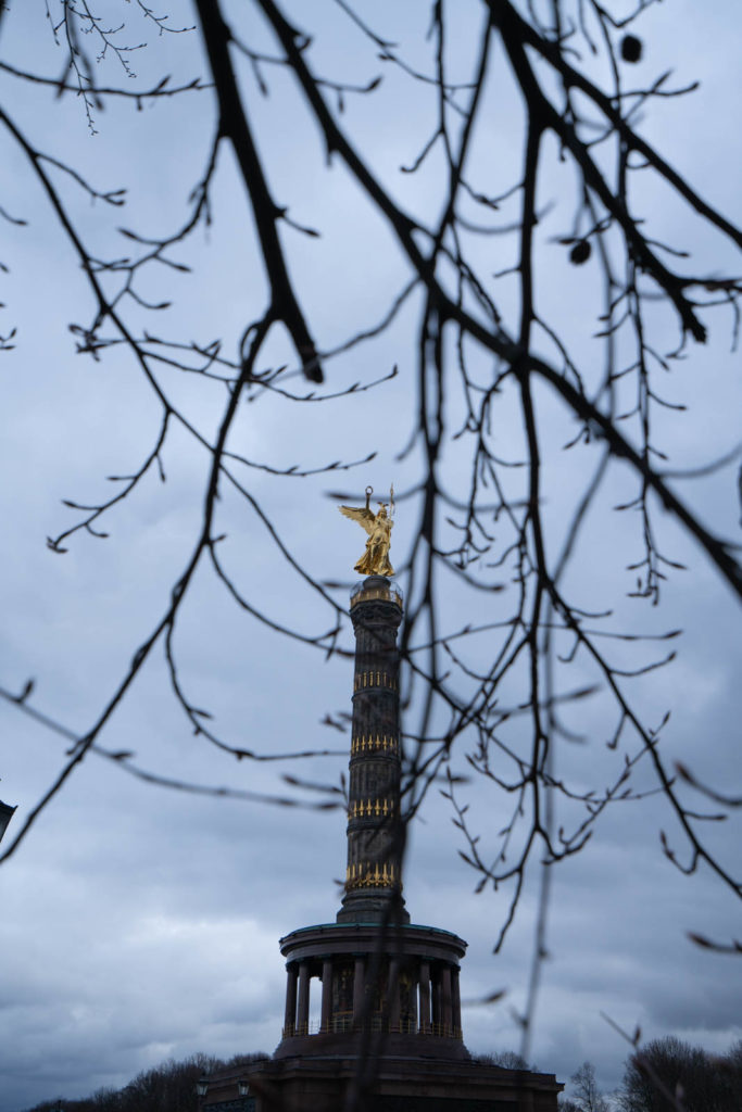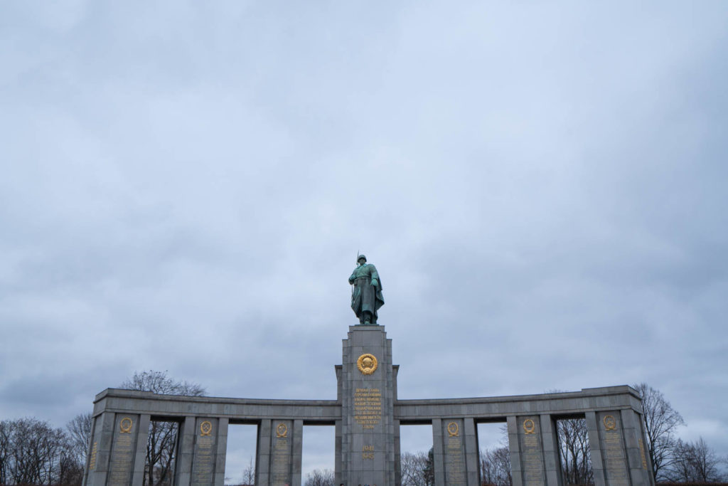 Early the next day we take the S bahn to Tiergarten, a huge park that encompasses several famous monuments. The sky is blueish gray, thick with clouds. We started on the Western end, walking to the Siegessäule (Victory Column). She towered up from the middle of a roundabout; the golden Goddess of Victory bright against the gloomy sky. We followed the main road lined with bare trees; their leaves fallen onto the also bare hedges like mismatched adornments. Just before the end of the park we reached the Sowjetisches Ehrenmal im Tiergarten (Soviet War Memorial Tiergarten), where a large group gathered to take a photographs and children clambered over tanks.