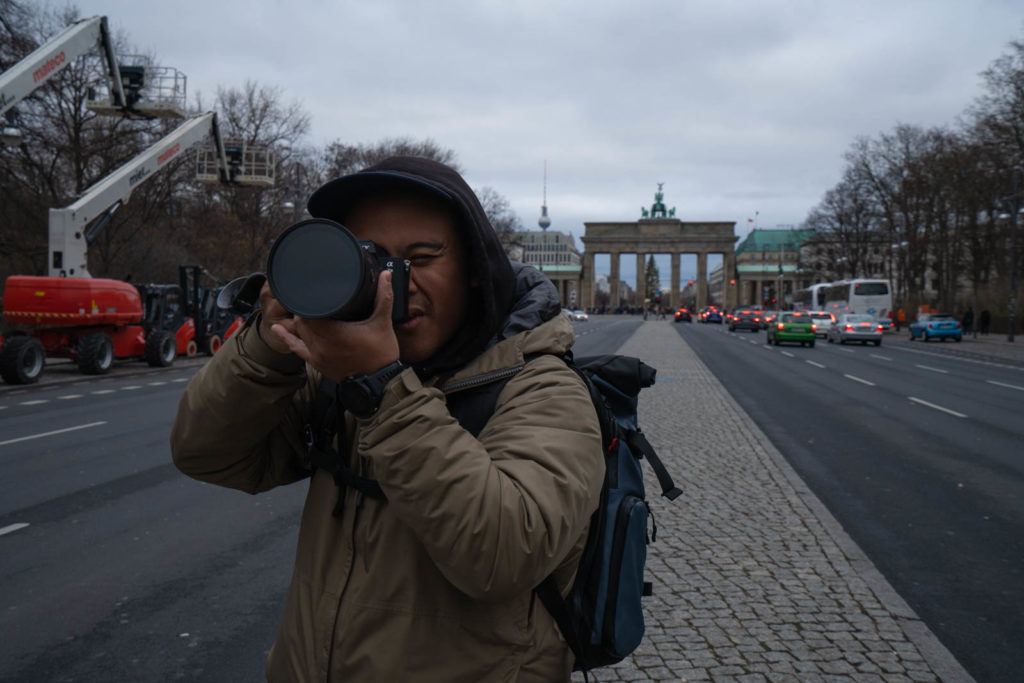 The edge of Tiergarten met with the Brandenburger Tor (Brandenburg Gate), now a symbol of Berlin’s unity and one of the busiest monuments. As we passed through the gate, we saw a crowd gathered around a man posing in the nude, concealed by a single colorful hat and standing atop a cart with his arms stretched out. We couldn’t understand his purpose nor the banner, but we were impressed by his tenacity given the extremely cold temperatures.