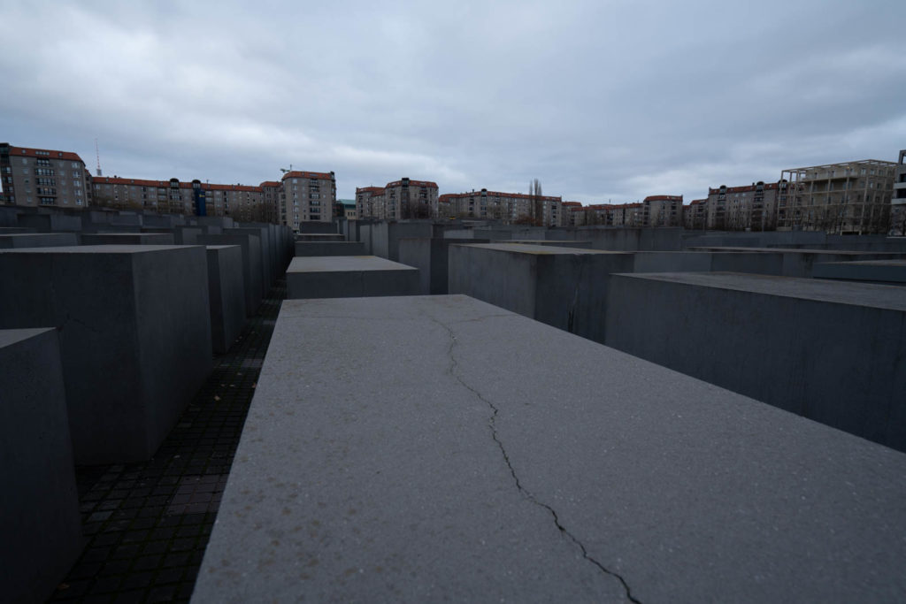 From Brandenburger Tor we make our way South towards Denkmal für die ermordeten Juden Europas (Memorial to the Murdered Jews of Europe), a most stunning concept for a memorial. The sight takes me by surprise, the sudden field of stone blocks surrounded by every day city buildings. There are tourists milling around, sitting on the stones or taking selfies: somehow it feels a bit desecrating. We move away from them towards the center, as we get further in, the slabs seem to grow and engulf us: gray around us and gray above us. I began to feel overwhelmed, so I turned to face a slab and studied the cracks and pores. That’s when I noticed that there were water stains running down the sides; like a window forever covered in rain, or a face forever covered in tears.