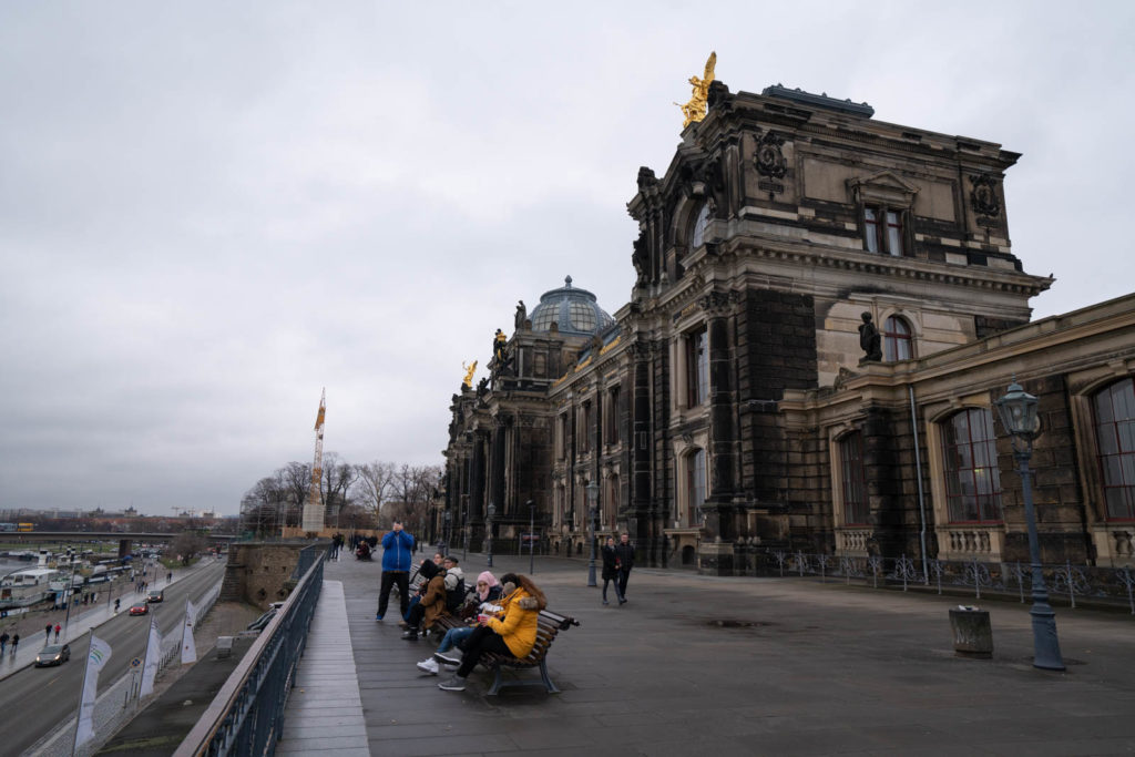 Our one day stopover in Dresden was just enough to get a taste of the beautiful city. We spent the morning walking through city center, starting just outside our aparthotel and stepping out into the square in front of the Martin Luther Kirche and passing through some of the smaller Christmas markets. We walked south until we crossed the river to Brühlsche Terrasse (Brühl’s Terrace), a touristy but beautiful riverside street. All the benches were occupied outside the stunning Hochschule für Bildende Künste Dresden so we continued on through the grid of trees just beyond the Ernst Rietschel Denkmal until we reached the square in front of Residenzschloss (Dresden Castle) where there was a medieval themed Christmas Market.