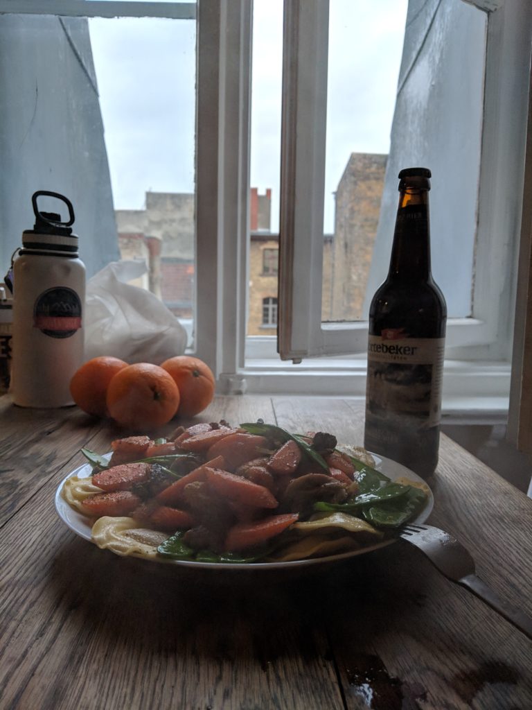 The morning of Christmas Day we made chocolate pancakes for breakfast and took our time heading out to the Christmas Market at Charlottenburg Palace, which was a little more grand due to the location and our discovery of an excellent hot chocolate from a chocolatier stand. We had some fresh mini donuts drizzled in a vanilla sauce and cheesy handbrots topped with green onions while we squeezed through the crowds. We passed a couple of light angels where everyone tried to take a photo and there was a great children’s play area with lit up swings and a miniature ferris wheel. When we finished our circle we realized we started at the wrong end because there was a stall that grilled whole fillets of salmon on an impressive open fire. We went home to spend the rest of our first Christmas together away from home, cooking a beef stew flavored with my new favorite German beer: Störtebeker Schwarz-Bier.