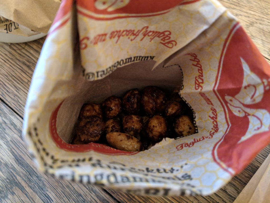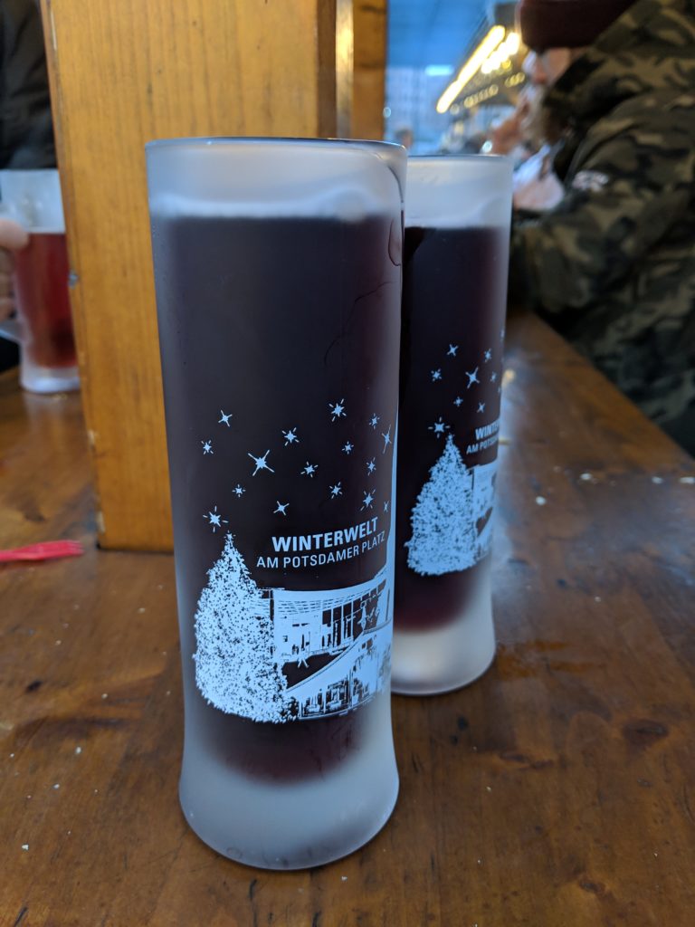 After the long walk and the emotionally draining visit to the Memorial to the Murdered Jews of Europe, we were ready for some nourishment. A short walk further south brought us to the Potsdamer Platz Christmas Market, famous for its giant slide for snow tubing. We rounded the block until the savory smells drew us to a particular stall with giant pans of mushrooms and potato wedges, which came in a crunchy edible bowl. A couple steps away brought us to some fried to order apple fritters, dusted with powdered sugar: a perfect pick me up. We browsed the market with some mulled wine to keep our hands warm and then called it a day.