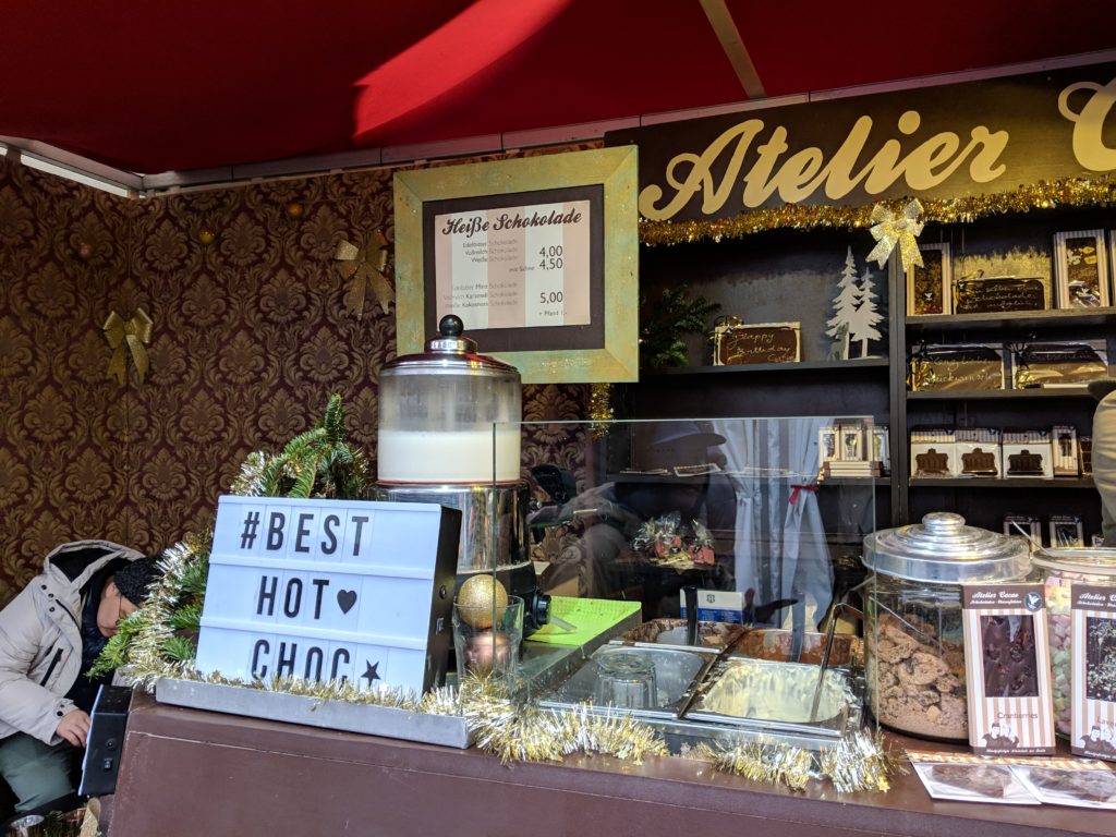Christmas Market at Charlottenburg Palace, – beautiful palace grounds, there’s a great kids play area. There’s a salmon grilling spot, fresh mini donuts, handbrots and an excellent hot chocolate from a chocolate stall.