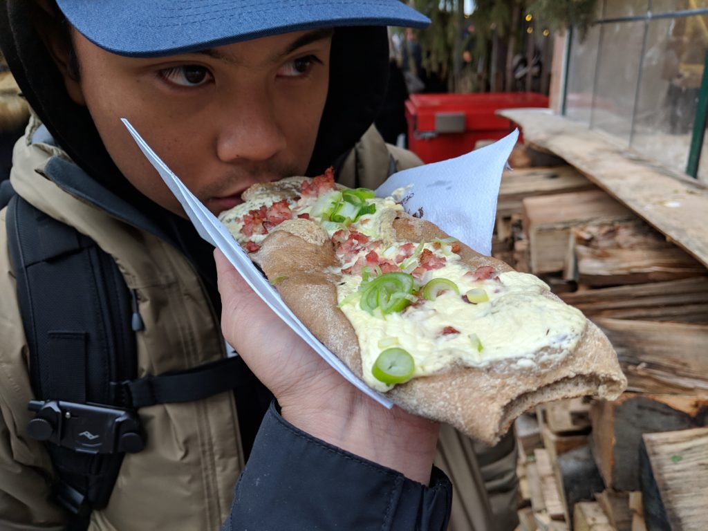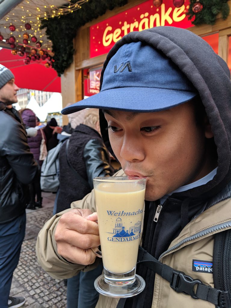 Following another solemn morning, we took lunch over at the Gendarmenmarkt Christmas Market. This particular market had a cover charge, but it’s definitely one you don’t want to miss if you’re looking to do some shopping. There was a whole covered indoor space for craft goods like jewelry and glass ware, lights and even a woodworking guy carving away at a large block; his wood shavings filing the tent with the perfect winter scent. It’s no surprise that Carl’s favorite Christmas Market food turned out to be flammkuchen, a German Pizza. We caught them pulling a fresh batch right out their wood fire oven and nearly burned our tongues from the rich melty cheese, watching the dough rollers throwing the dough at their window to startle passerbys. We followed that with some freshly cooked spaetzle – my very first taste of spaetzle and as a noodle gal it really hit the spot; washed it all down with some orange punch and eggnog and then headed home.