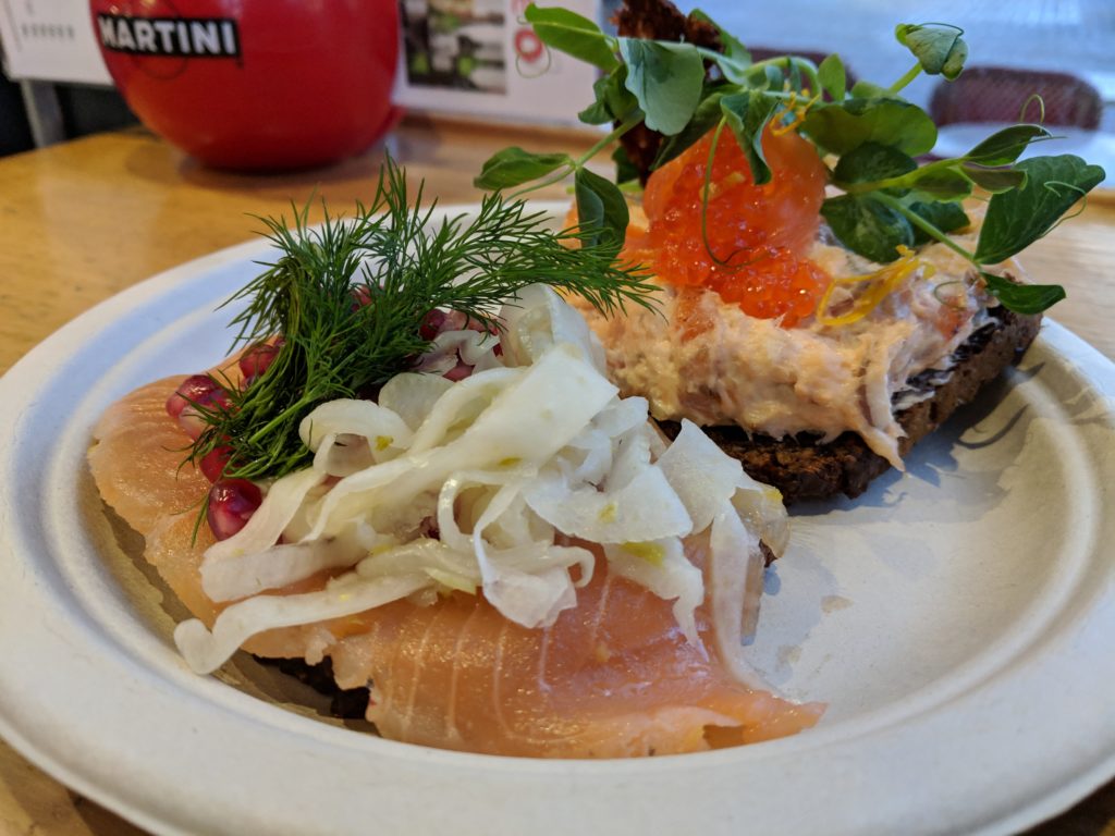 Our first stop was Hallernes Smørrebrød, typical Danish open-faced sandwiches, some topped with fried onions and beef or tuna and roe. The difficulty is, if you purchase food from a stall, there’s really no seating indoors. Most seating indoors belongs to the restaurants and while there’s plenty of seating outside, it just wasn’t ideal in the cold. After trying to covertly wolf down our smørrebrød at the edge of a counter, we decided we would take anything else we found back home.