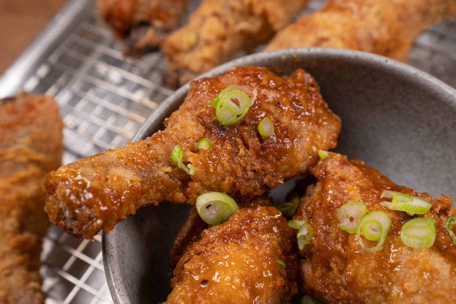 - First Fry: 350F – cook drumsticks to a light golden brown, then remove from oil and allow to drain on a wire rack. This will only partially cook the chicken.
