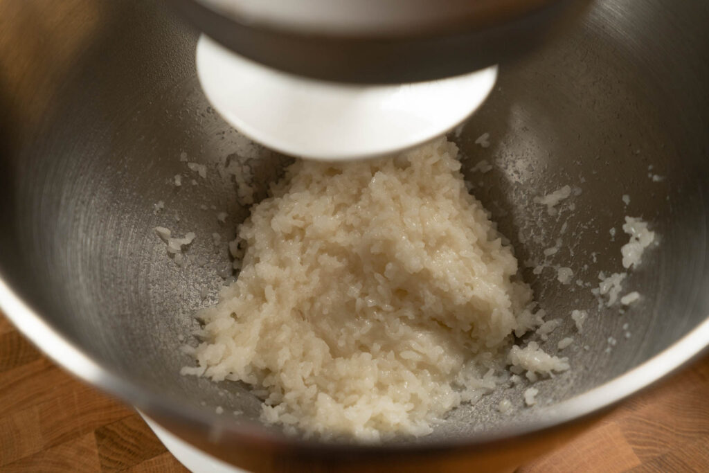 6. After 12 minutes of kneading, the rice should be quite sticky and almost smooth. Scrape down the bowl and flip the rice over again. Swap out the dough hook for the paddle.