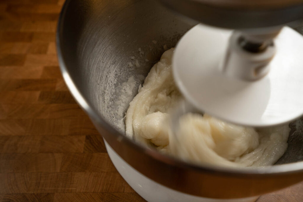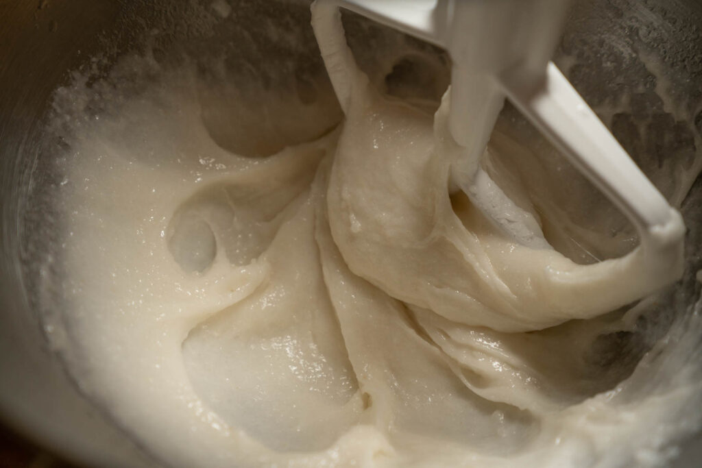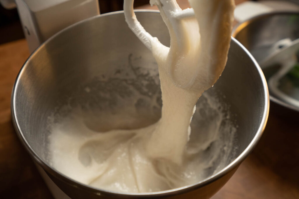 3. Use this time to prepare everything else. Pre-scoop/ball your filling and place in the freezer. Freezing the filling allows you to stuff the mochi with more filling than you could normally, and it’s much easier to work with. Starch your work surface. Ready your cupcake liners or whatever you choose to keep your finished mochi in. About 5 minutes before the rice is ready, place your dough hook, paddle, and spatula in the KitchenAid bowl with some hot water to get everything warm.
