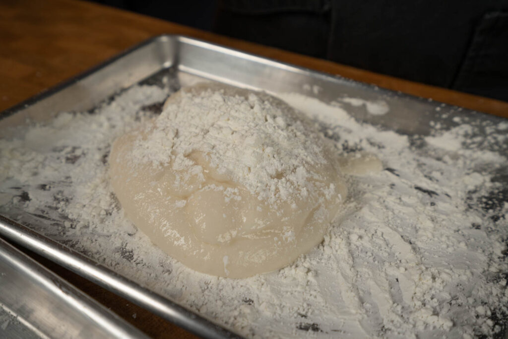 9. Scrape mochi onto starched surface. With dry hands, starch the top of the mochi and your hands generously.