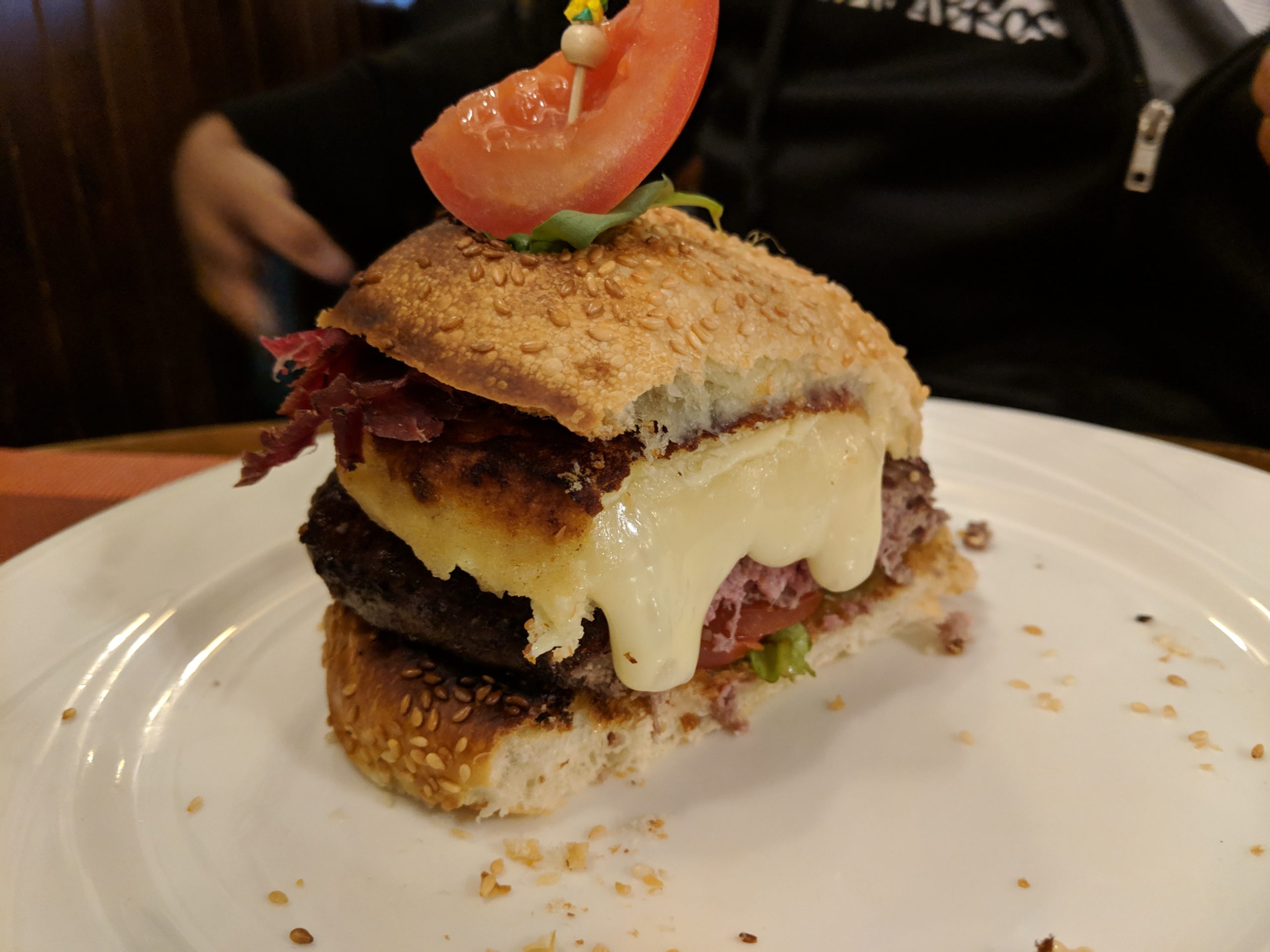 We quickly dug in, alternating between dipping bread chunks, cornichon pickles, and potatoes into the decadent cheese, then taking a slice off the meat plate to wrap around a pearl onion. The fondue was so rich that we welcomed the sharp zing from the pickles and the onions. Only half way through the cheese and we could already feel the heaviness slow us down, but luckily Rick Astley’s “Never gonna give you up” started playing. We laughed, emboldened as he sang “never gonna let you down”, plunging yet another piece of bread into the cheese, twirling it and watching the glorious cheese drip thickly. By the time we finished, Carl declared he was “cheese drunk” so we sat watching the tea light under the fondue pot flicker slowly; our little table grew warm and the food coma started to set in.