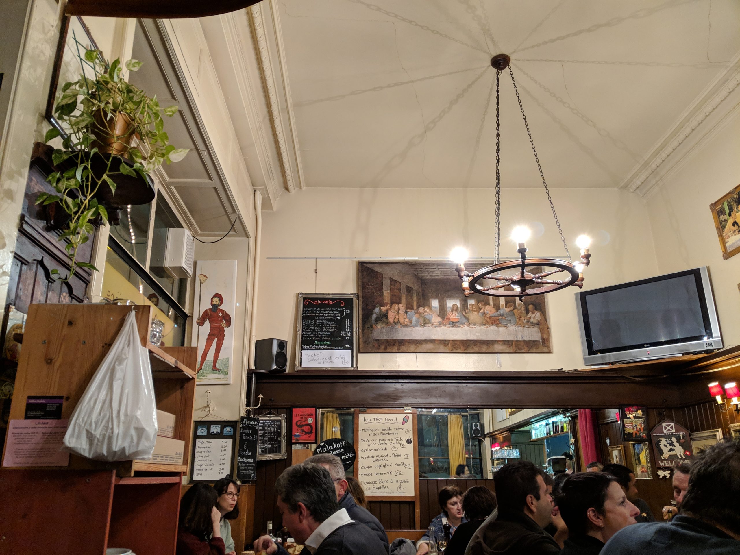 Fondue is probably the most signature Swiss meal and it was especially perfect during the winter season. We made reservations at a local favorite for fondue Cafe la Coulouvreniere, a super cozy restaurant with the most fantastic cheese themed classic art; like Mona Lisa holding a fondue stick or fondue served at the Last Supper. We had an early reservation but the room quickly filled, brimming with conversation and laughter. Each time the door opened and someone walked in, it sounded as if they were regulars – we felt rather envious, imagining some sort of special fondue club. Luckily the aroma of our shallot and bacon fondue arriving to our table quickly eased our disgruntled spirits; our mouths salivated as we watched the cheese bubble in the pot.