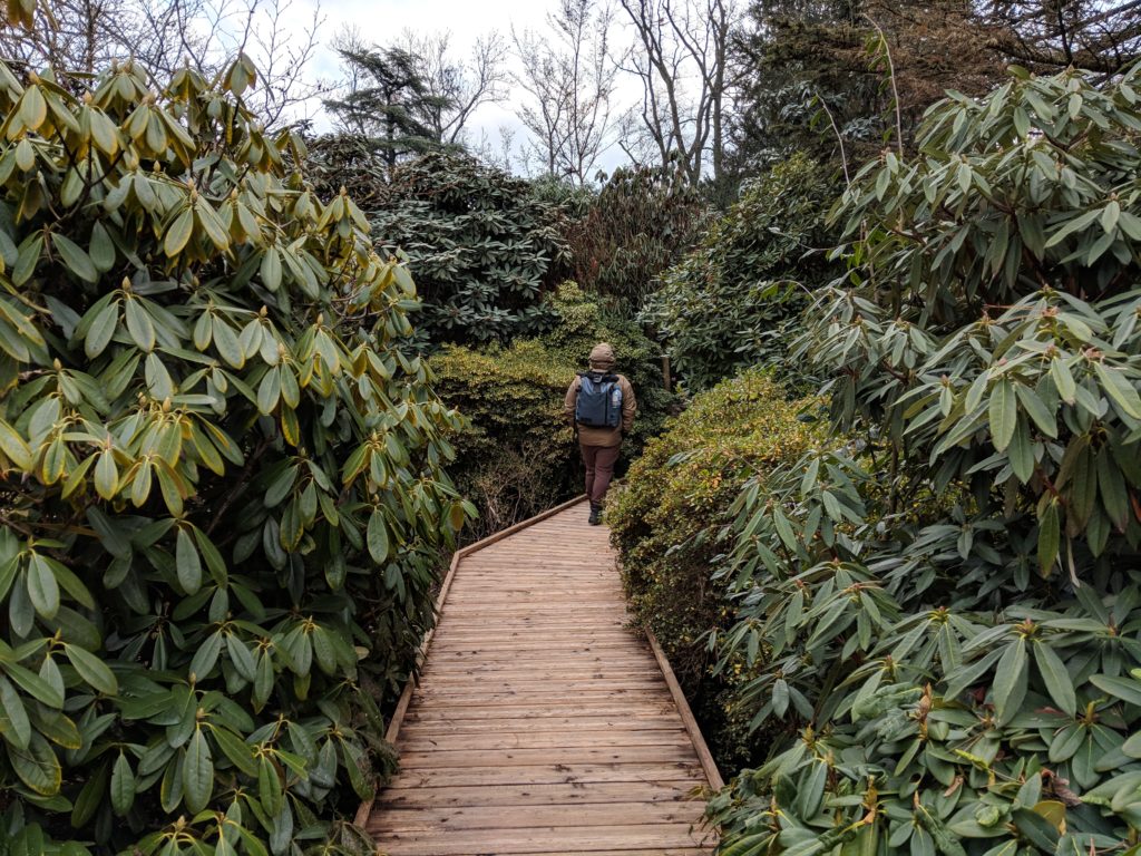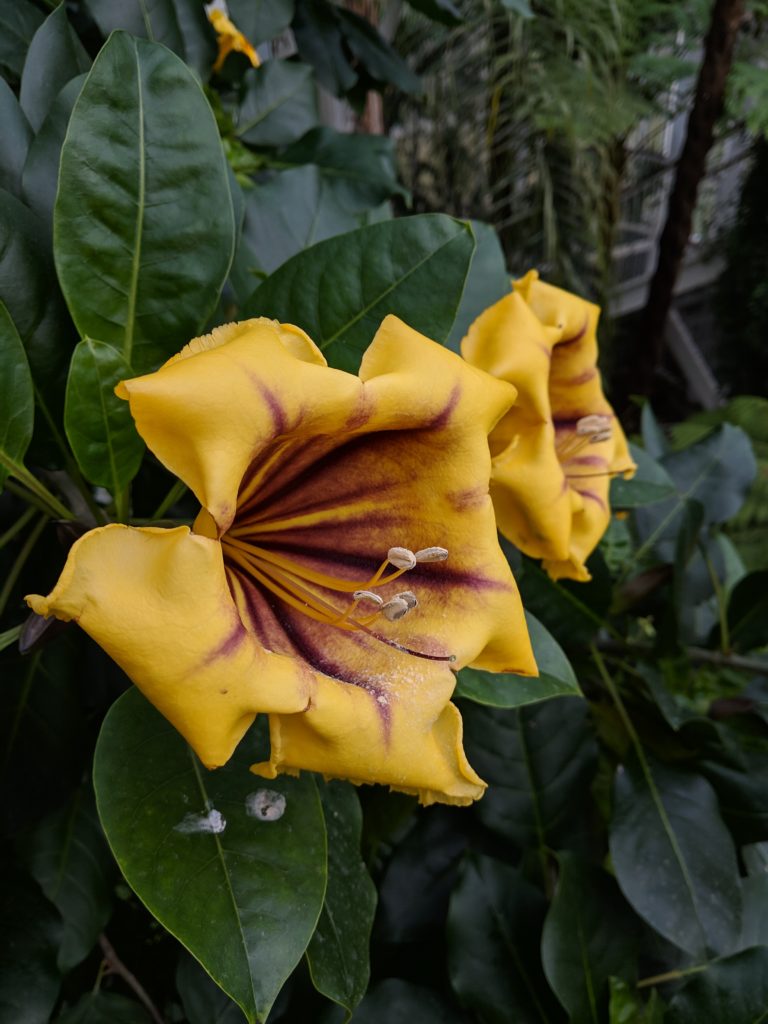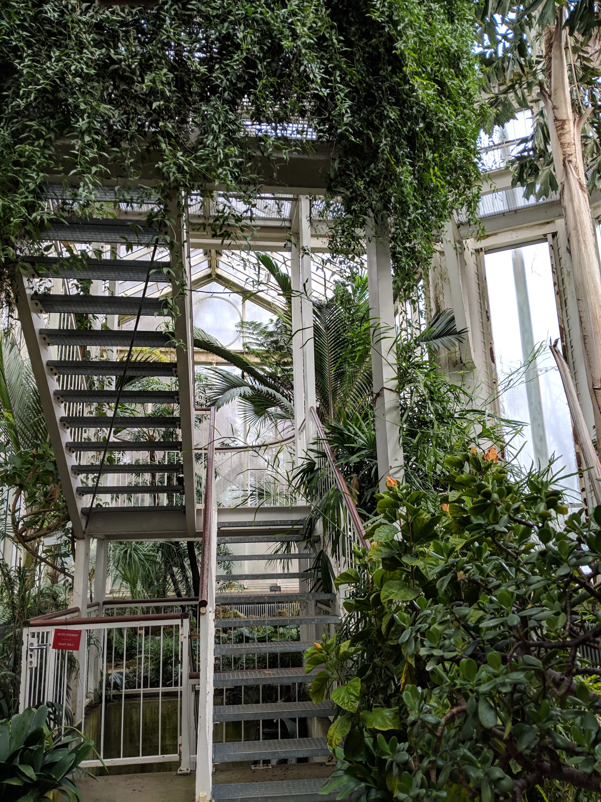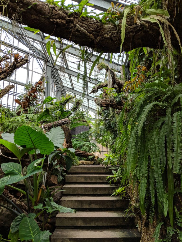 The animal park was modest with some deer and ducks, it was fairly inactive though some of the animals might have been taken in due to the cold. There was a lovely educational garden organized by plant type such as medicinal, aromatic or fibrous, but with the chill in the air we zoomed over to the botanical greenhouse, where we soaked in the warm humid air and pretended to be somewhere tropical instead. I fell in love with the main atrium of the greenhouse, which was quite tall and had a set of stairs laden with leaves that we took up to the upper rim where obtuse yellow lily-like flowers bloomed with red centers that looked almost like blood stains. Though slightly alarming, it just added to the strange magic of being able to look down upon the treetops.