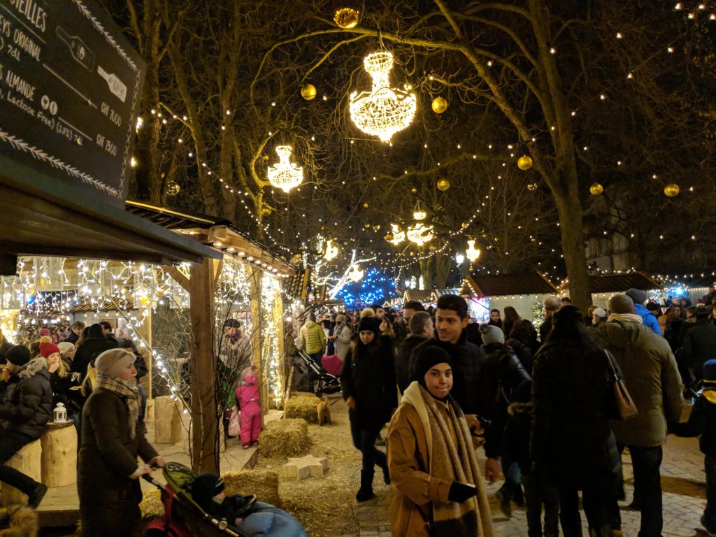 Though chocolates are good any season, they are crucial for the wintertime as they can alleviate the darkness and warm the soul, which is likely the same idea as Christmas Markets. By the time we got to the Market it was well after nightfall, but the park was lit up with innumerable lights and crowded with families and large groups of friends. Turned out Saturday was a great day to go to the Geneva Christmas Market, as it appeared that most of the city center was closed by evening, and the weekend definitely brought more people out, which normally we don’t enjoy, but the extra bodies helped us stay warm while outdoors.