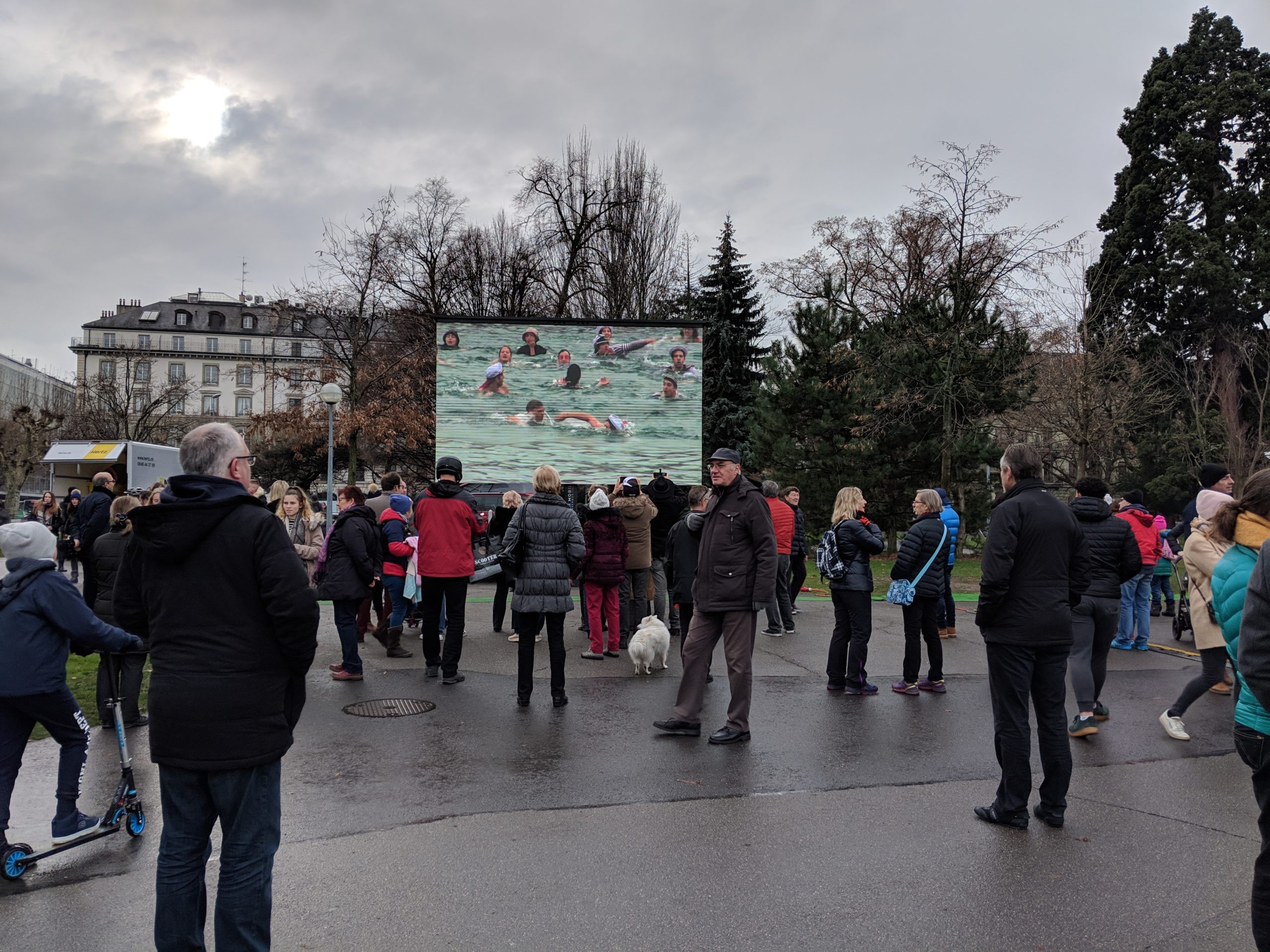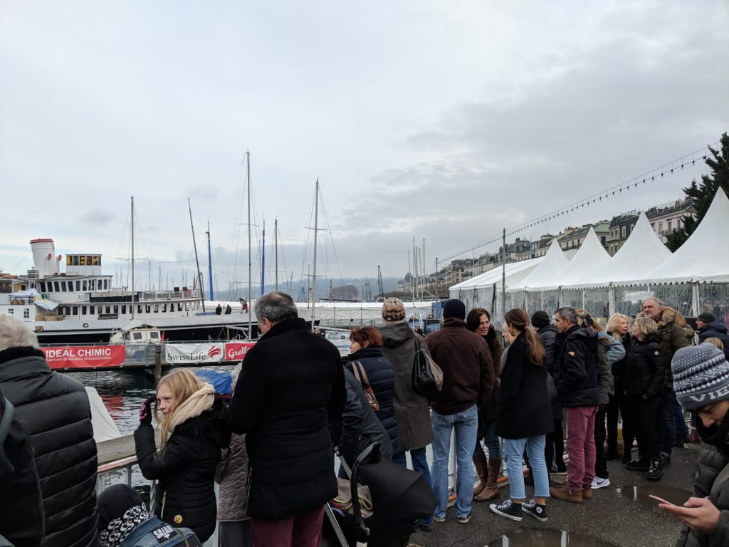 Like most of Europe, Sundays in Geneva are super dead: most shops and restaurants are closed. While it’s not ideal for us visitors, we’ve found it inspiring for a culture to commit to a day of rest and emphasize a balance in work and life. Unfortunately for us, we were a little unprepared and wound up wandering around the city looking for someplace to grab lunch. We walked over to the quai, where there was some sort of lake plunge event. Hundreds of gutsy (or just plain crazy) costume and swimsuit clad adults huddled onto the pier to jump into the lake for maybe a 50 meters swim in the freezing water. Crowds of us looked on and there was even a projected screen so you could see up close the swimmers as they poured lake water on themselves, attempting to acclimate their bodies before jumping in. It was great fun watching (and not participating) but it made us all the hungrier for something warm and cozy. Sadly we ended up going to Starbucks for a quick sandwich when we couldn’t find anything else open close by.