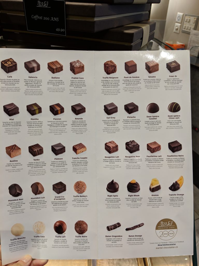 Martel Cornavin, martel-chocolatier.ch/boutiques-tea-rooms, Rue de Cornavin 16, $-$$ – This location is also a tea room, but we simply bought a box of chocolates from their counter. Though it’s elegantly furnished, we were pleased with the unpretentious service. We were able to look at their menu and pick which chocolates we wanted and simply paid by weight.