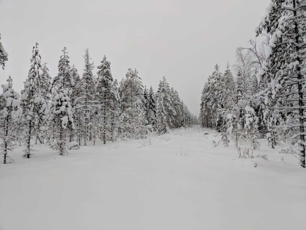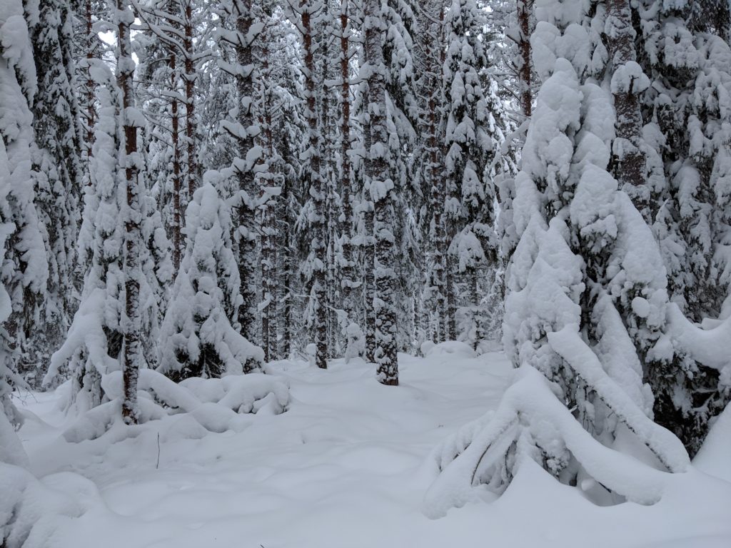 The Seitseminen National Park stretched like an endless untouched carpet of snow, trees lining the edges, melding into the gray dusky sky. The snow was so thick here, I finally understood the phrase “laden with snow” looking at all the bowed trees. We blindly followed Tomas and Lin, turning surprising curves along the unseen path; our crunching boots were the only signs of energy out in the quiet fields of white. Snow crystalized on the branches and yet those sprawling mounds of soft fresh snow, everything felt so pristine and delicate, so delicate that some impish part of me was tempted to plow through it all. Break the stillness, test the form! There was something so spectacular about being on in the wintry wilderness and experiencing this magical element of snow: natural, pure, harsh, cold, soft, round, sparkling, sharp, opaque, clear.