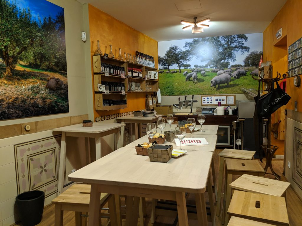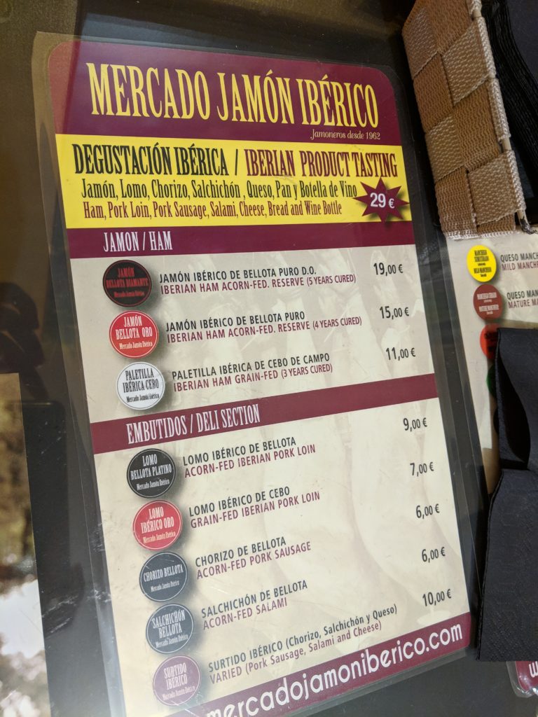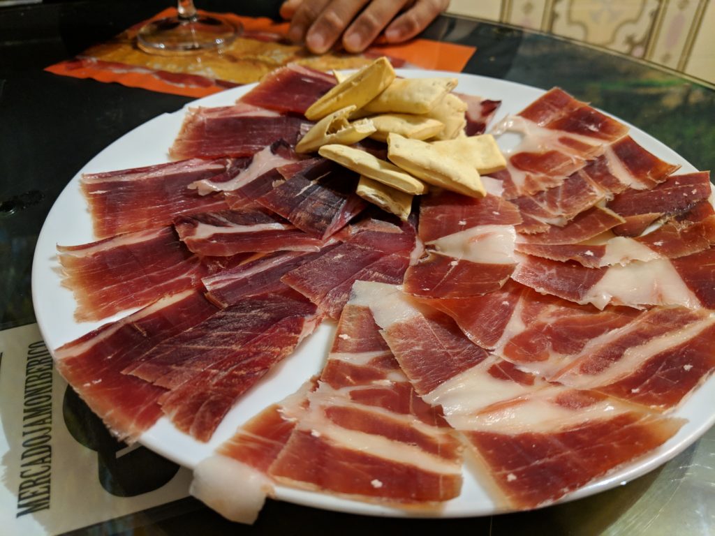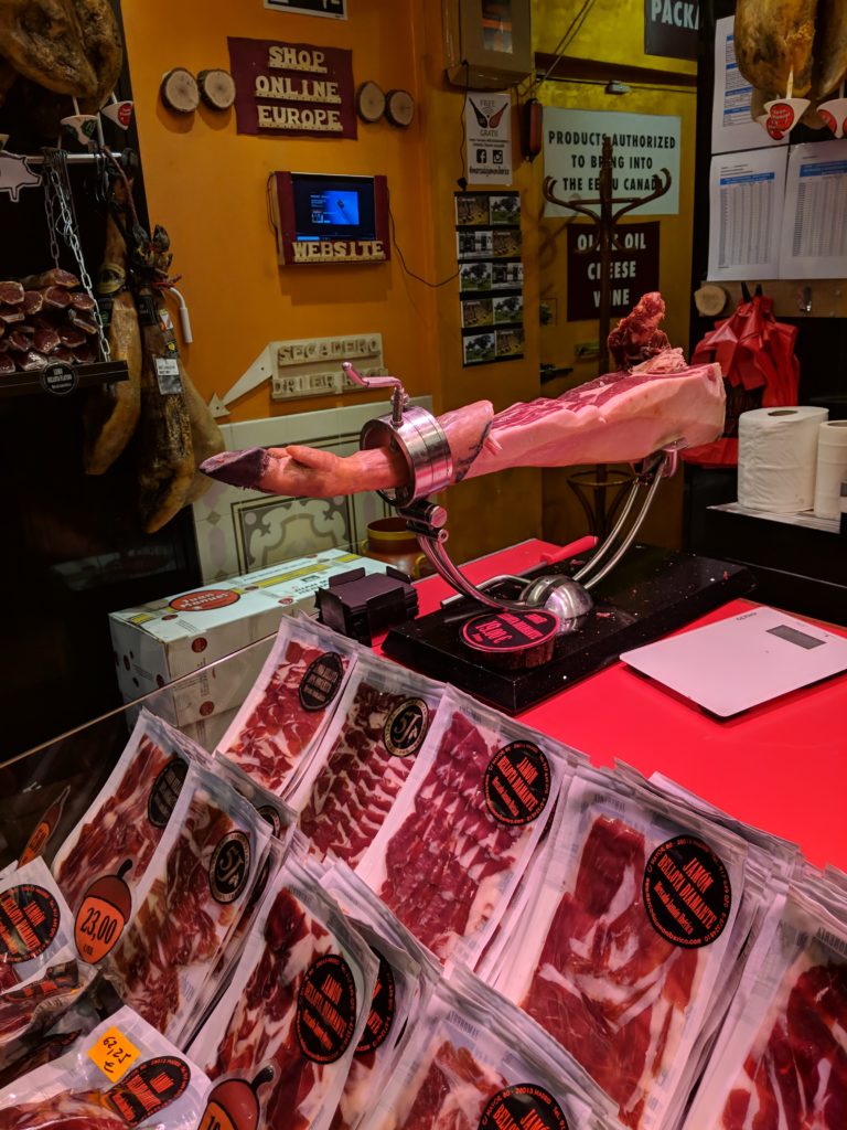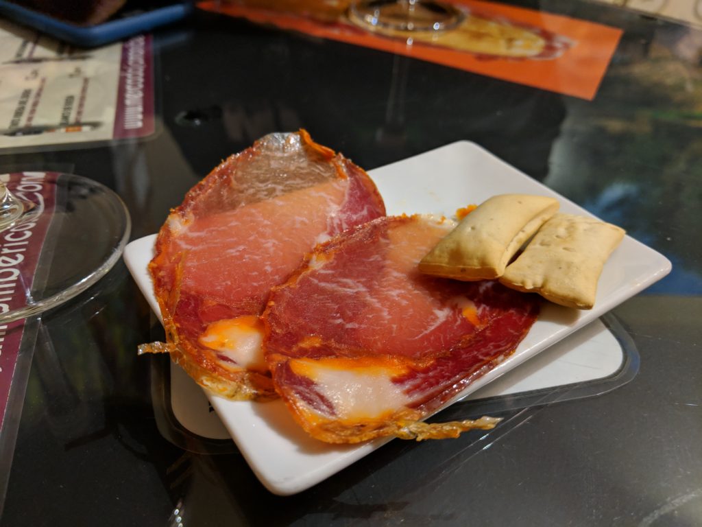 And just down the street from the Mercado San Miguel and Bar Cerveriz, is Mercado Jamon Ibérico, where we finally got to sample the ubiquitous ibérico ham. When we first arrived the place was packed and we debated waiting or finding another spot. We were already feeling a little overrun from the Mercado San Miguel so we decided to walk around the block and see if a table would open up. Alas, we returned to a full room again. But we didn’t want to give up – we came to this shop was specifically so we might try a variety of ham and maybe learn a little something, rather than just pick a pre-sliced packaged ham randomly anywhere and call it a day. So we worked up the nerve to ask the guy if we could do a sample plate anyway, and we were so glad we did. He got us settled at a table in the back where they host a class, recommended his favorite red wine and sliced us a big platter of two of their most popular hams. We preferred the one aged almost 6-years, which was milder in flavor but almost melted in the mouth, compared to the 4-years.