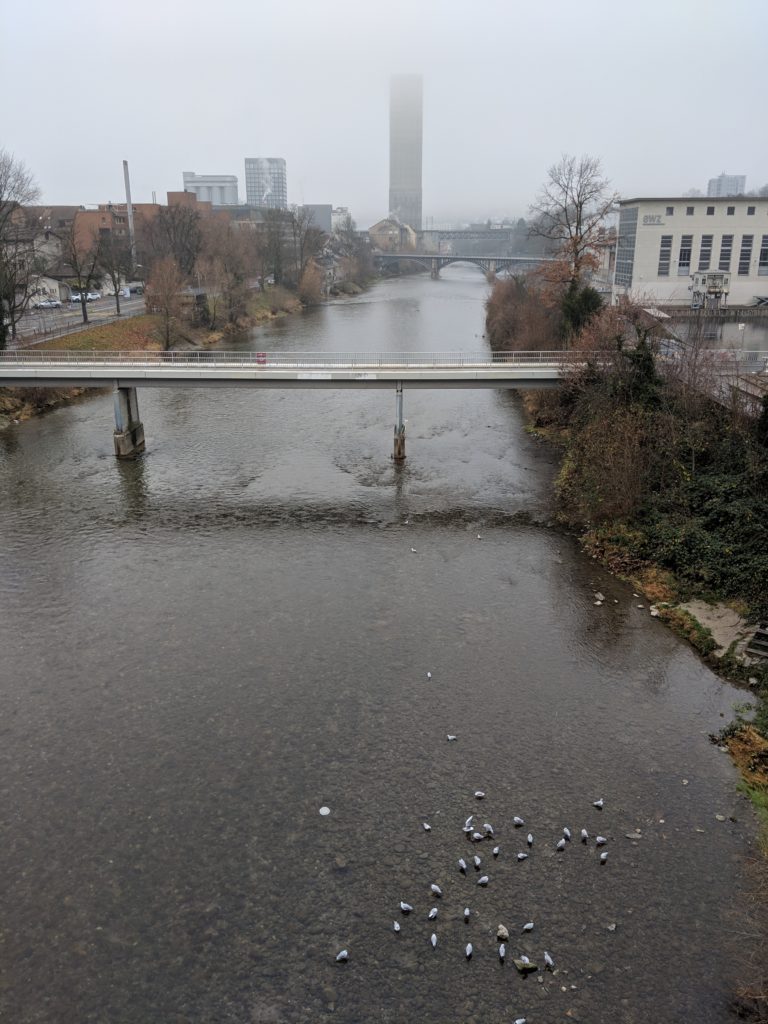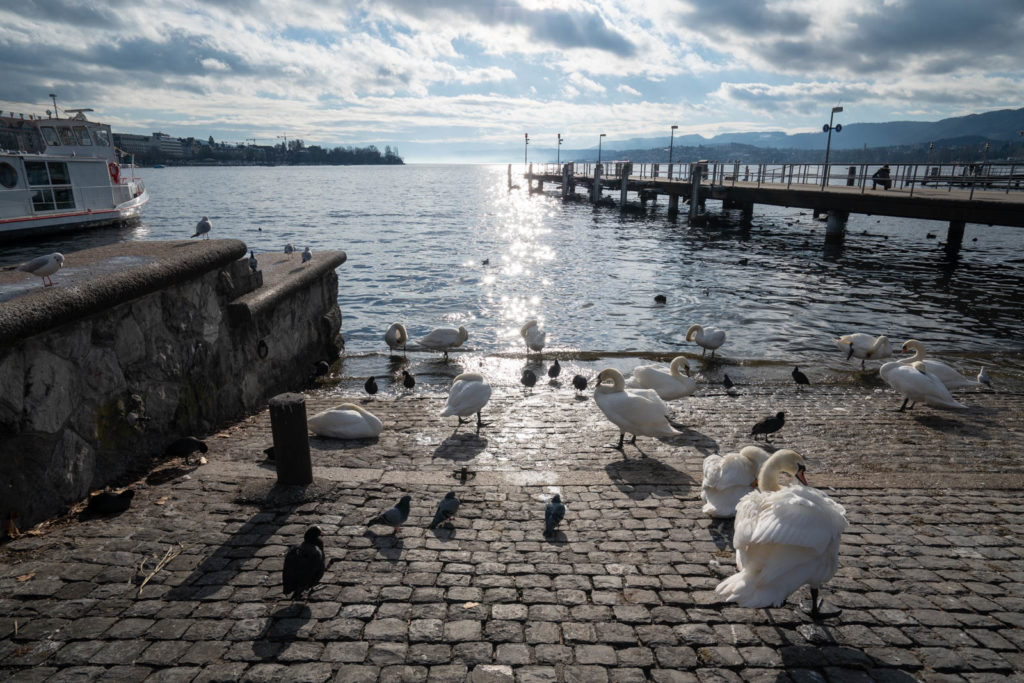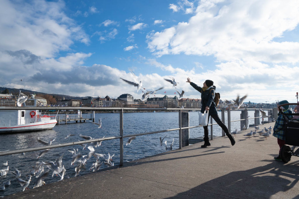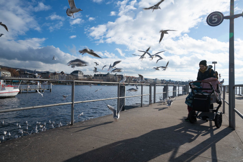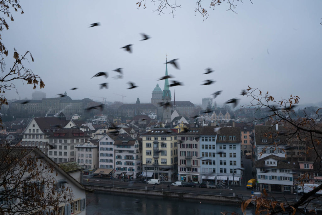 We crossed over cobblestone through stately buildings with quaint shuttered windows, passed water fountains with beds of bright pansies, and we found a narrow street away from the throngs of holiday shoppers to the quiet and almost empty City park Lindenhof. There was however a horde of pigeons guarding the water fountain as we approached the ledge to look out across the river. Despite the still foggy day, we could see the church spires and cranes peeking up between the buildings across the way. As a flock of birds swooped over the water, the park suddenly came to life with a large group of runners cutting through, pairs of neon running shorts standing out harshly in the winter air. Following the runners was an equally energetic group of kids clad in much more muted school uniforms, chasing each other among the trees.