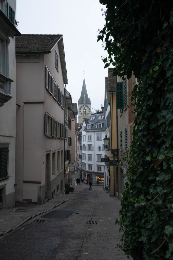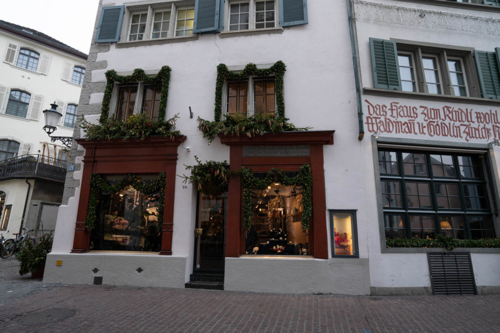 According to the forecast we were getting a variety pack for our visit: one rainy day, one sunny day, and one cloudy day. We planned to visit Uetliberg and get a view of Zurich on our one sunny day, but that morning we stepped outside and it’s completely foggy. As we walk through the city, the buildings are almost invisible, so we decide to wait out the fog and maybe save the mountain visit for another day. Instead we spend the morning exploring District 1 and enjoying all the Christmas decorations among the shops.