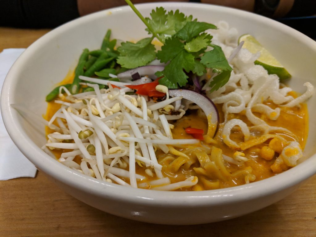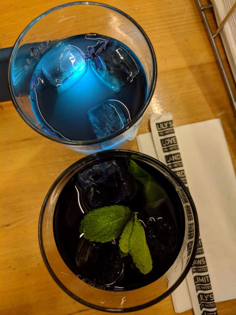 We locate the hipster style street food restaurant with long picnic tables and cozy up between some other young looking people. We spot a few of those signature iced teas, so we join the club and order a Butterfly and a Chilling Blue; tall glasses of a deep purple garnished with mint and a cool blue with tiny purple flowers floating in it. For a good 5 minutes we amuse ourselves trying to photography the colorful tea. We try to discreetly use the obnoxious phone flashlight to light up the glasses and wind up just giggling to ourselves. We don’t have long to wait before our order of Pad Thai or Chiang Mai noodles comes in, at around 20 CHF a plate, which is the average price of a plate in Switzerland but shocking when compared to the $10 average at home. Luckily it turns out to be good quality stuff, some of the best pad Thai and Chiang Mai noodles we’ve ever had (caveat: we’ve not been to Thailand yet, but headed there this coming summer).
