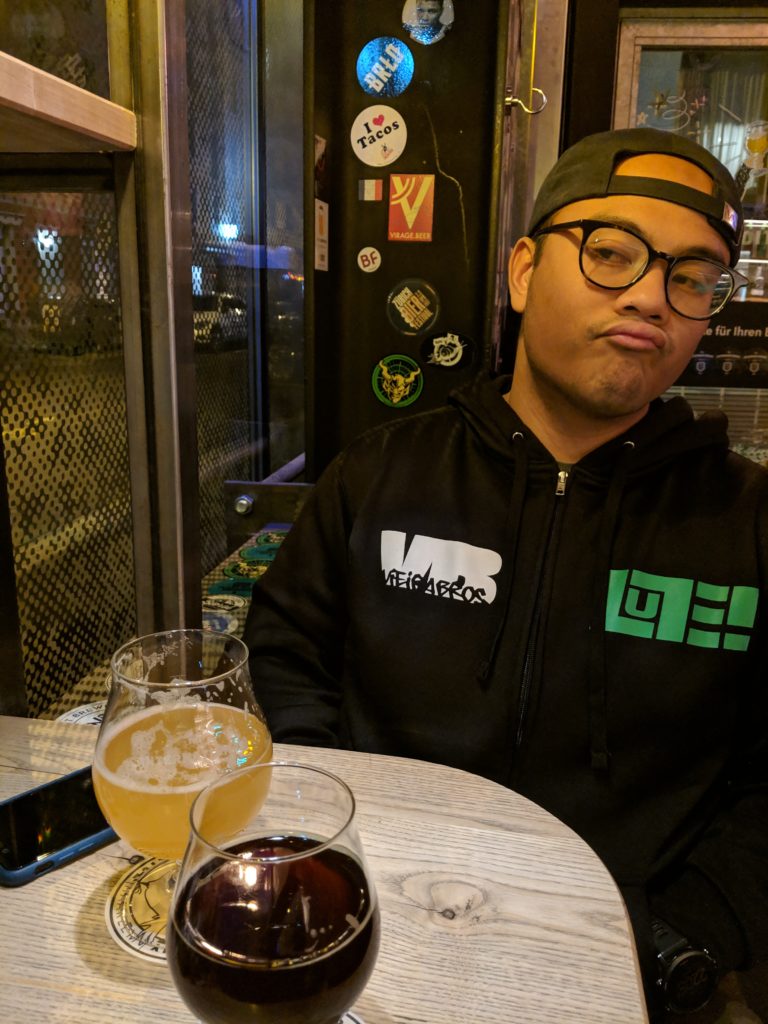 After trying to balance out our pricey lunch with a home cooked dinner, we decide to treat ourselves (it’s an endless cycle of give and take) with some craft beer at International Beer Bar. Back in the Bay Area we have a pretty big craft beer culture, so I’m always up to checking them out wherever we go. We elect to pre-burn some calories by walking over to the International Beer Bar in the crisp clear night air. The corner it’s on is dark, but cozy lights beckon from within. A big group is squeezed around a single circular bar table by the door, but there are plenty of intimately tucked tables towards the back of the L shaped room. The chalkboard menu boasts a myriad of names more colorful than the chalk, like “F*** Trump’s Gramma”, which was a very pleasant pumpkin/yam beer. As they offer many international beers, most of them are bottled and rather pricey and only a handful are on draft. We grabbed our beers and received a Lego pizza man as our tab ticket and hopped up onto a couple stools by the window. I sipped at my heavy but smooth Konrad Stout and we chatted quietly to ourselves, occasionally watching as someone stepped outside to smoke; their cigarette a single light in the darkness.